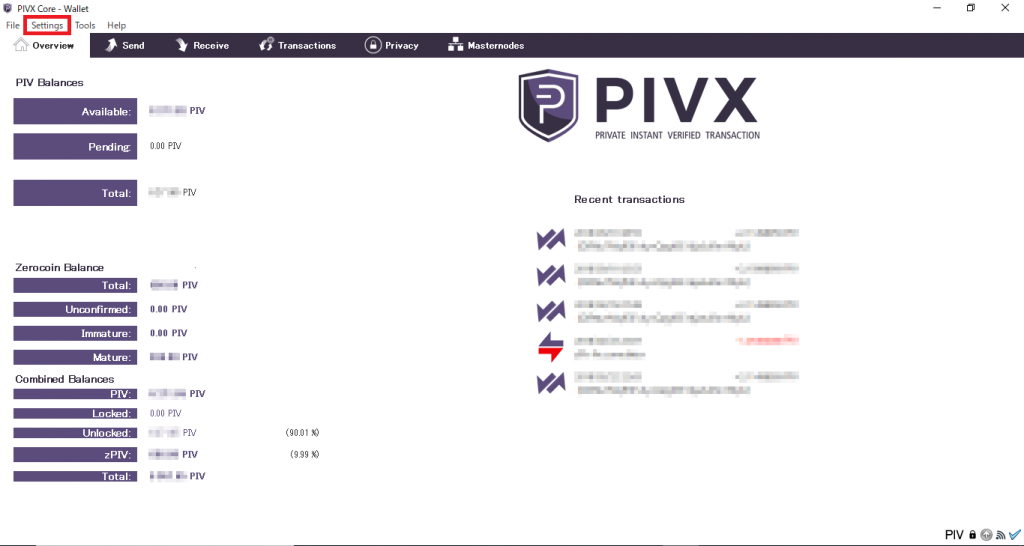 上段タブの【Settings(設定)】をクリックします。もちろんステーキング(ミンティング)するにはPIVXウォレット内にPIVXを送金しておく必要があります。PIVXは1ピヴクスからステーキング報酬を獲得可能ですが保有する保有枚数によって鋳造される頻度は違ってきます。保有枚数から大まかな獲得報酬を予測してくれる計算機はコチラ⇒ PIVX Rewards Calculator