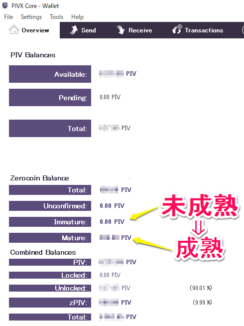 初めてPIVXウォレットにコインを送金すると一旦、Zerocoin Balance(ゼロコイン残高)にある【Immature(未成熟)】へ自動的に振り分けられます。それからしばらく(半日~1日ほど)成熟期間を経てそのコインが【Mature(成熟)】の方へ移動し、ステーキングが開始します。上で述べたようにステーキングが開始されるとウォレットのアイコンがグリーンへと変わります。