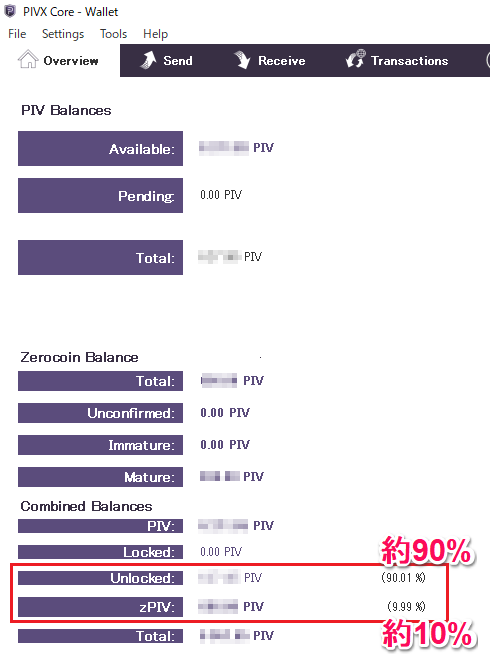 PIVXウォレット内の総額PIVコインの約10%がzPIVへ自動的に振り分けられます。(PIV⇒zPIV)