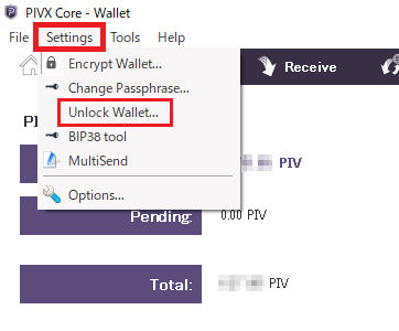 【Settings】⇒【Unlock Wallet...】をクリックします。