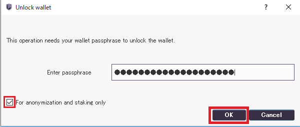 ②「For anonymization and staking only(匿名化とステーキングのみ)」にチェックを入れて【OK】をクリック。