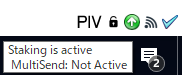 コイン成熟後(本文下部で解説)にPIVXウォレットの右下にあるアイコンがグリーン(緑色)になっていればステーキング(ミンティング)が開始されています。アイコン上にポインターをおくと『Staking is active MultiSend: Not Active(※)』と表示するのでステーキング中かを確認する事ができます。もしもウォレット右下に上記のアイコンが見えない場合は、、、