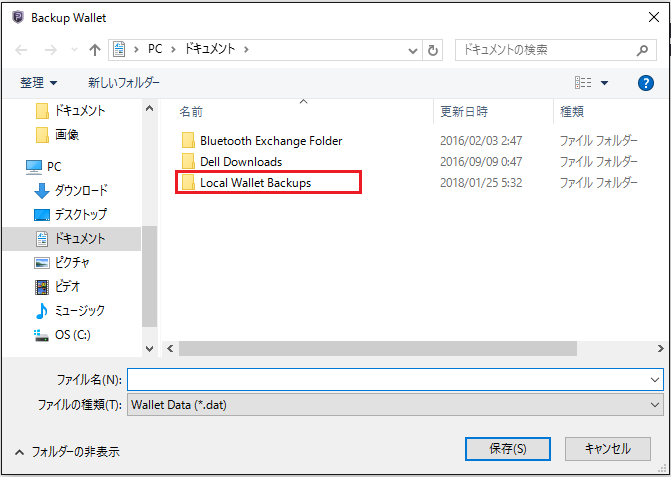 ファイル名を記入してバックアップファイル(.dat)の保存先を指定する。デフォルトだと「ドキュメント」に保存されます。今後のバックアップファイルをまとめる為にも上記のように『Local Wallet Backups』のようなフォルダーを事前に作成しておくことをおすすめします。