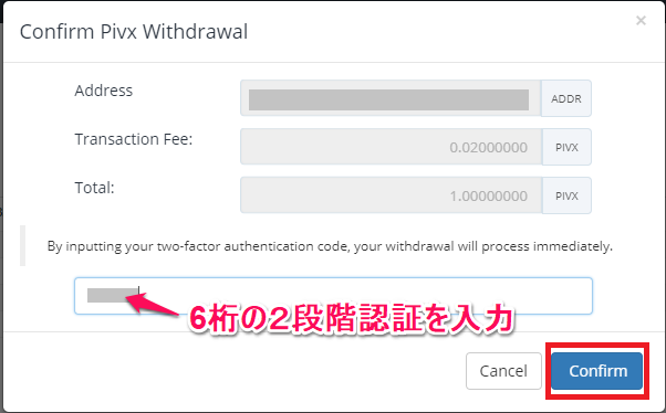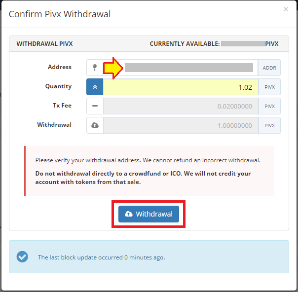 Confirm Pivx Withdrawal、ピヴクスの引き出し確認の小窓が開きます。先ほどPIVXウォレットでコピーした受け取り用のアドレスを上段の「Address」枠へペースト(貼り付け)します。1Pivxをピッタシに送金したい場合には送金手数料分(当日のレートで0.02Pivx)を足して「Quantity」のとこに送金額1.02Pivxと記入します。最後に【Withdrawal】をクリック。