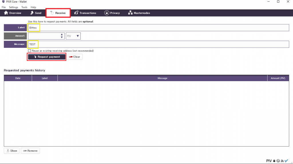 まず『PIVX』ウォレットを立ち上げ、ウォレット上段タブの【Receive(受け取り)】をクリック。