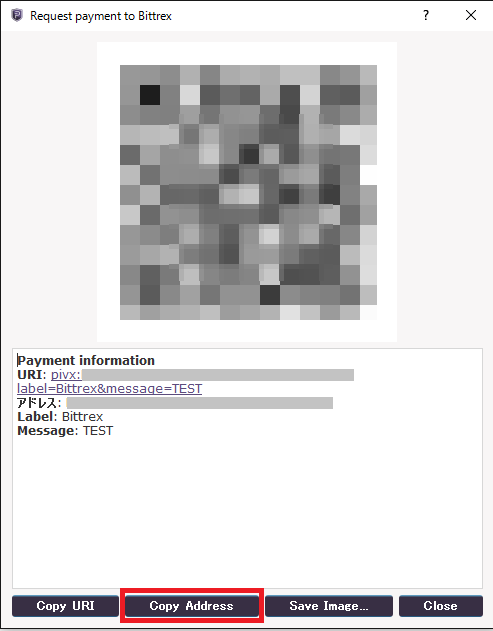 今回は送金元の取引所がBittrexなので【Label(ラベル)】に『Bittrex』と記入します。次にその下の【Message(メッセージ)】にあとあとテスト送金と分かるように『TEST』と記入、そして【Request payment】をクリックします。※Reuse an existing receiving addressと記載された☑ボックスがありますが、既存の受け取りアドレスで受け取りたい場合はチェックを入れてください。ただし新規アドレスを作成されることをおすすめしています。