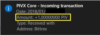 すると瞬く間に【PIVX Core - Incoming transaction】Amount(量)+1PIVXが送金されたとのお知らせがWindows10のパソコンへ届きます。