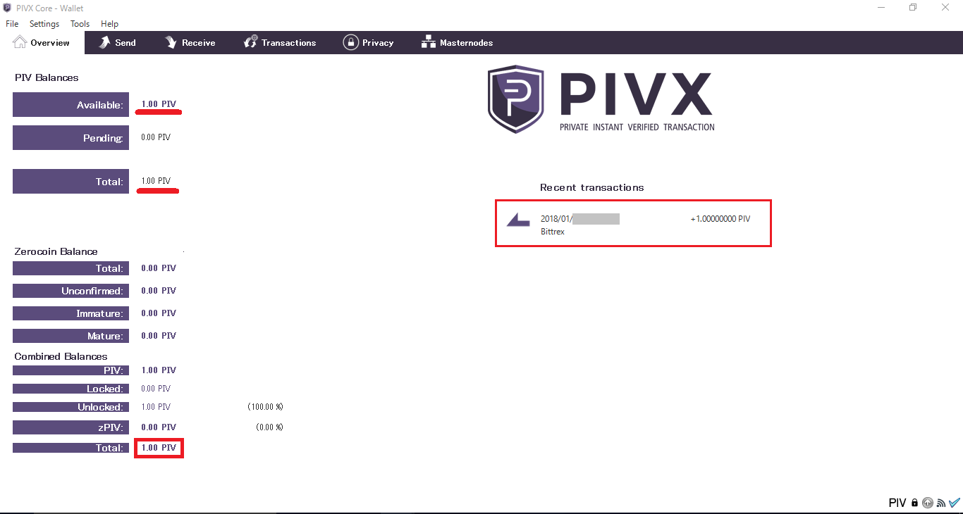 もちろんPIVXウォレットの方でもキッチリと1PIVが送金されたのが確認できます。