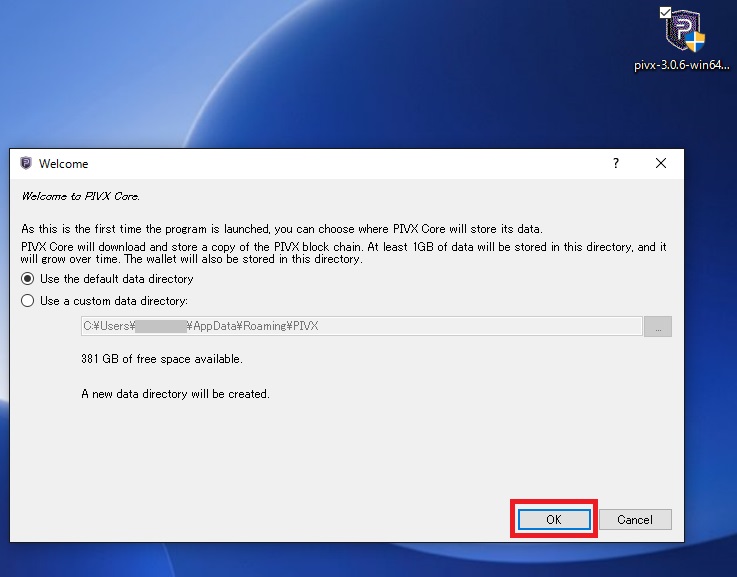 初回のプログラム起動時のみ『PIVX Core』データの保存先を選択、そしてPivxのブロックチェーンのコピーを保存します。最低1GBの空き容量が必要です。デフォルト(初期設定)でOKなら【Use the default data directory】のままで【OK】をクリック。