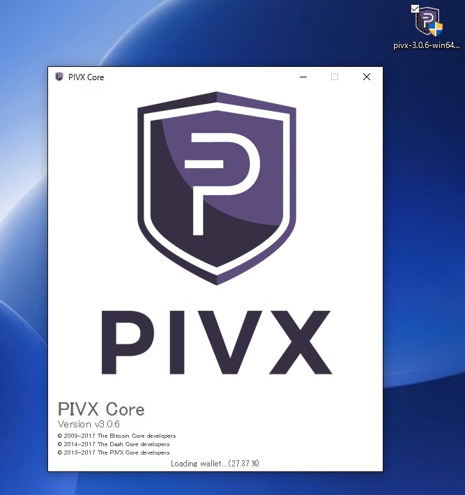 Pivxのブロックチェーンのコピー保存が開始します。しばらく待つ