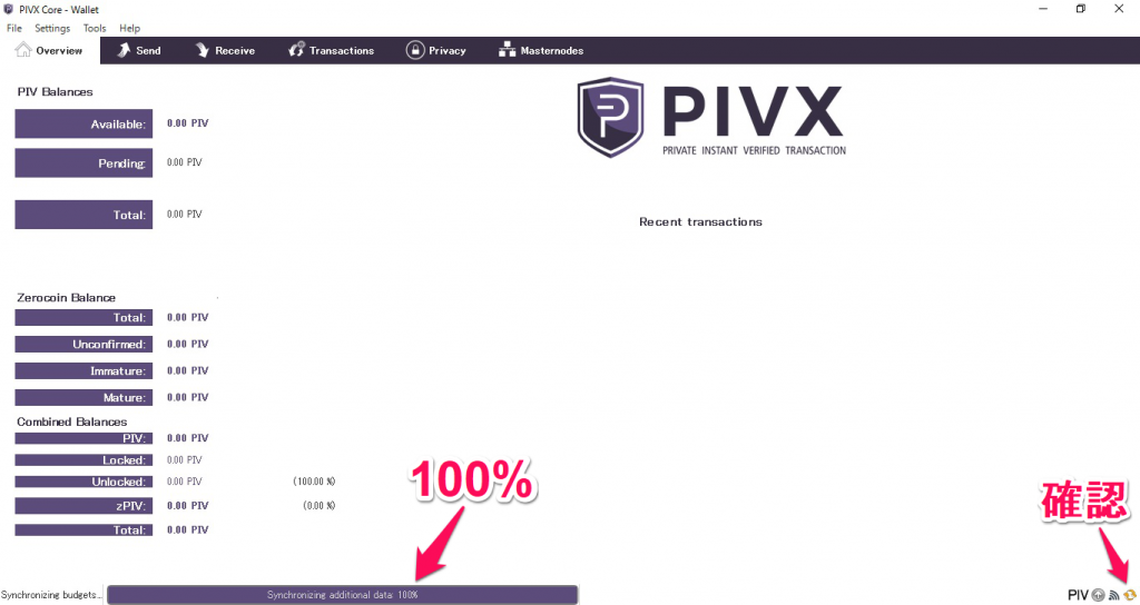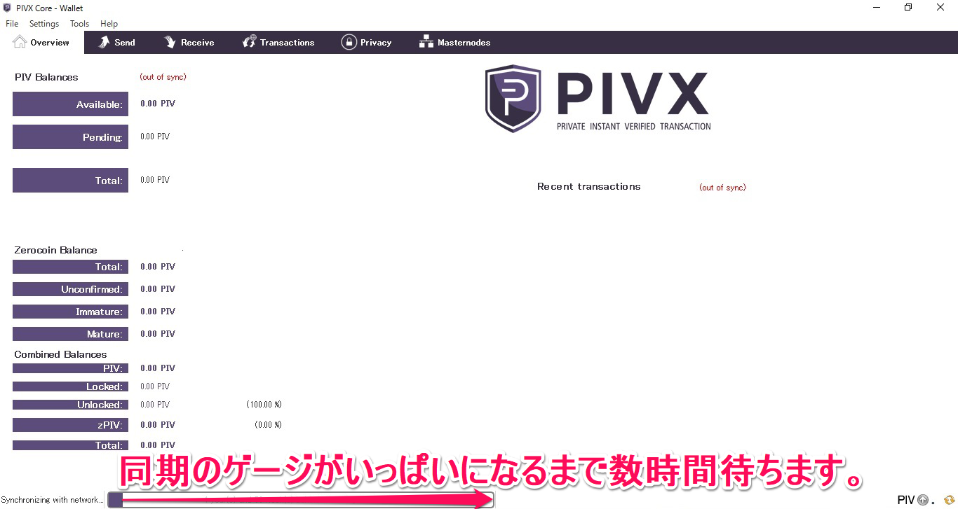 PIVXウォレットが立ち上がると同時にネットワークの同期が開始されます。パソコンの環境によっては数時間ほど掛かりますので同期が完了するまで気長に待ちます。