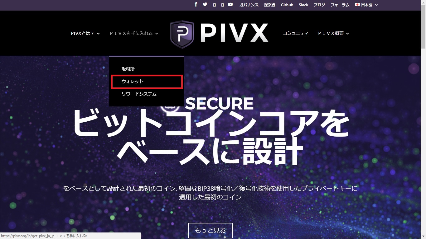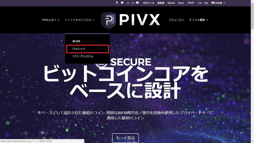上段タブの【PIVXを手に入れる】から【ウォレット】を選択。
