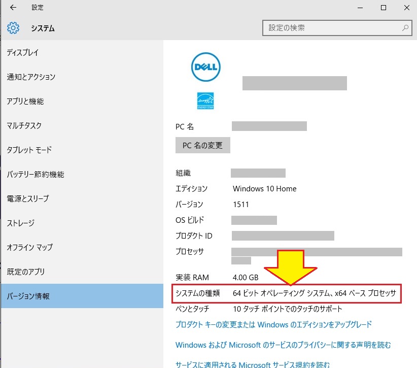 【設定】⇒【システム】⇒【バージョン情報】⇒システムの種類を確認する。