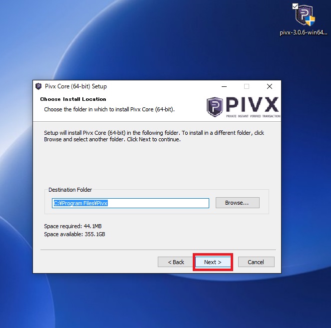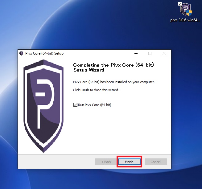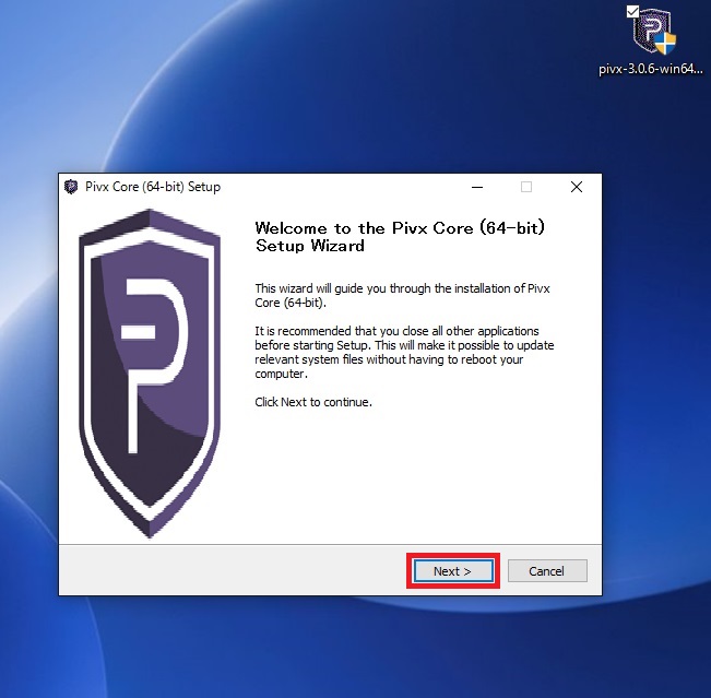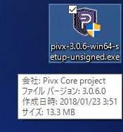 デスクトップの『pivx-3.0.6-win64-setup-unsiged.exe』をクリック