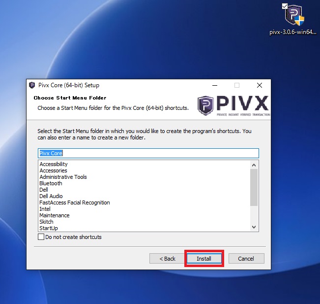 スタートメニューフォルダー名が「Pivx Core」で問題なければ【Install】をクリック。ショートカットのアイコンを作成したくない場合は「Do not create shortcuts」にチェックを入れて下さい。