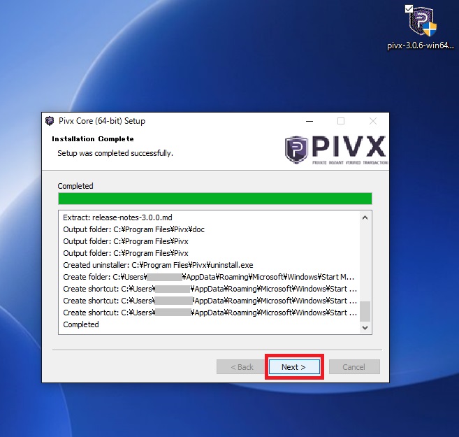 「Complete」と表示されれば、Pivx Core(64-bit)のセットアップは完了です。【Next】をクリック。
